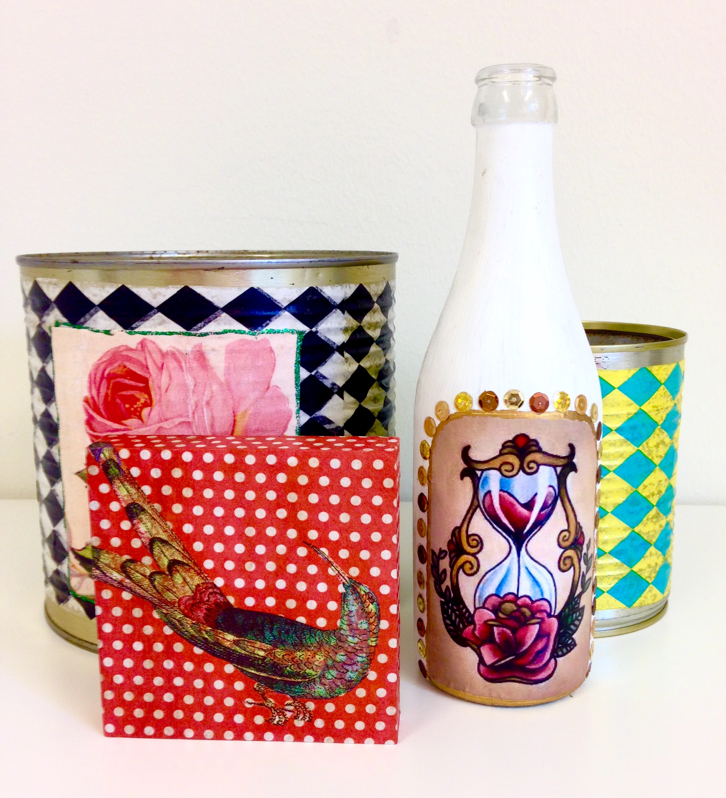 Vi experimenterar med decoupage och collage. Dècouper betyder helt enkelt att klippa ut. Ursprungligen är det en teknik för att dekorera vardagliga föremål.  Vi provar på att arbeta med servetter, papper och ett speciellt limlack. Vi dekorerar askar, skålar, galgar, snäckor och stenar. Man kan också jobba med decoupage och bildcollage.